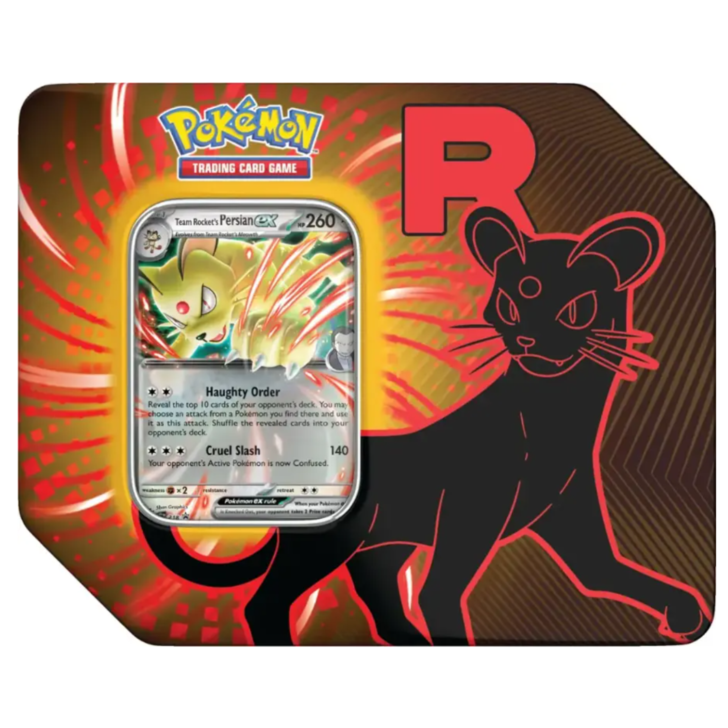 Aim for World Domination with Team Rocket! Bring your ambitious plans to fruition by joining forces with some of Team Rockets toughest Pokémon! With this tin, choose the strategic mind of Team Rockets Mewtwo ex, the potent toxins of Team Rockets Nidoking ex, or the prideful power of Team Rocket's Persian ex as a foil promo card, then discover more Pokémon and Trainer cards inside a handful of booster packs.